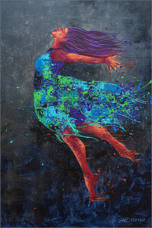 “Created for a Juneteenth celebration, this acrylic painting captures the spirit of liberation. A figure erupts into motion, rising with strength and radiant color. Splashes of paint stream from her form like energy released; capturing the joy, resilience, and power embodied for Freedom Day.”
